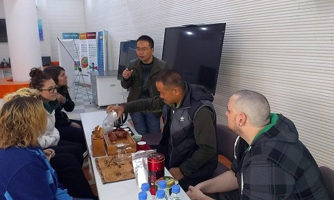 11月20日上午,基础部敖军老师付臣静和马继伟老师在我院图书馆一楼数字化教室,给加拿大留学生传授了中国茶文化的知识内涵。首先,付臣静老师利用PPT给留学生讲解了中国茶文化的相关知识,接着敖老师从中国的茶文化起源讲起,边讲解边演示茶器、茶具和泡茶的工艺流程等。泡茶期间,敖老师主要给留学生讲解了中国绿茶、红茶、白茶和花茶等。留学生第一杯品尝了绿茶,大家纷纷表示确实口味独特,与他们品尝的其他饮料很不一样;第二杯品尝的是红茶,同学们表示味道及口感很不错,有利于养生。因时间原因,留学生只品尝两种中国名茶,希望能再次品尝地道的中国茶。最后,敖老师赠送每位同学一个茶器作为纪念品。