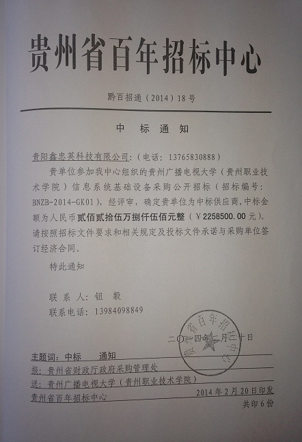 贵州广播电视大学(贵州职业技术学院)信息系统基础设备采购项目中标公示