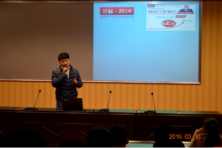 紧接着,陈宇老师带领大家学习《2016年政府工作报告》,他主要从“成绩2015、回顾2015、目标2016、展望2016、成就‘十二五’、奋斗‘十三五’”六个方面进行讲解。讲解的过程当中,陈老师注重互动,联系实际,语言幽默,让同学们便于理解和记忆。