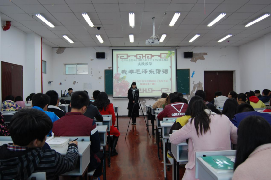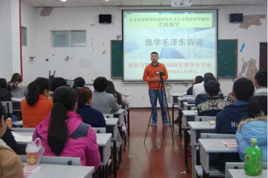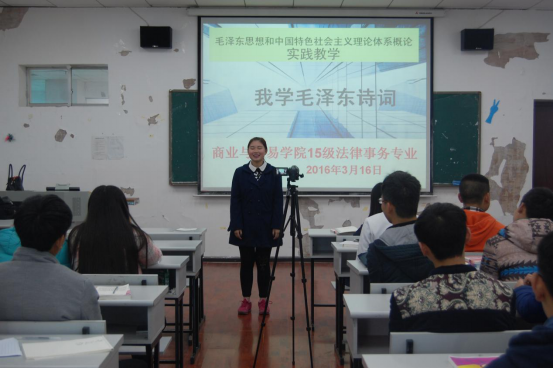 2016年3月16日在B808教室,商业与贸易学院15级法律事务和电子商务专业的全体学生,在《毛泽东思想和中国特色社会主义理论体系概论》课程授课老师陈国敏教授的组织下,以“学习毛泽东诗词”为主体的实践教学活动如期开展。同学们纷纷走上讲台,透过毛泽东一首首诗词的字里行间,深深感受到毛泽东作为一个伟大的马克思主义者、无产阶级革命家、战略家和理论家,作为中国共产党、中国人民解放军和中华人民共和国的主要缔造者和领导人的豪情壮志。在朗诵过程中,每个同学都积极准备,尽量克服紧张、自信心不足、缺乏感情色彩等现象。这次活动将选拔参加学校比赛的选手。