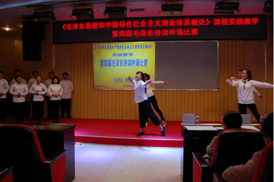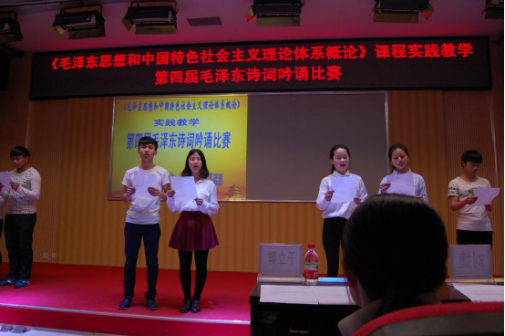“世上无难事,只要肯登攀。”针对思政课教学存在的枯燥性特点,学院思政课教师开动脑筋,积极思考大胆探索。2016年3月19日下午,我院公共基础部在图书馆二楼学术报告厅开展《毛泽东思想和中国特色社会主义理论概论》课程实践教学暨第四届毛泽东诗词吟诵比赛。毛泽东在马克思主义中国化方面,有许多精辟独到的见解,贡献最大。在毛泽东诗词中,就有许多表现他独到精辟见解的地方。思政教研室设计毛泽东诗词吟诵比赛的目的是通过此次活动“在做中学,在学中做”,把毛泽东思想的学习与形式多样的吟诵结合起来,达到更好的学习效果。