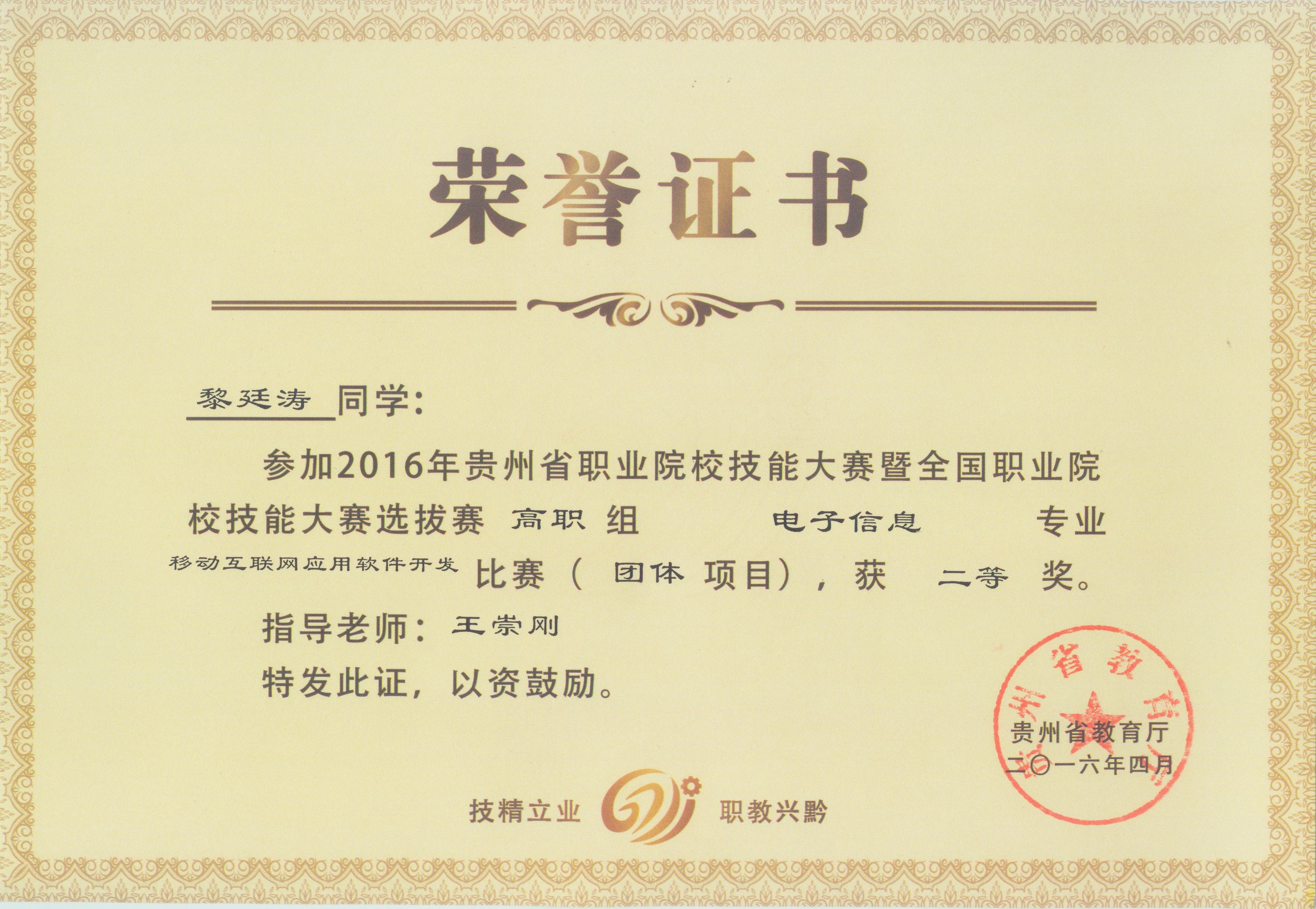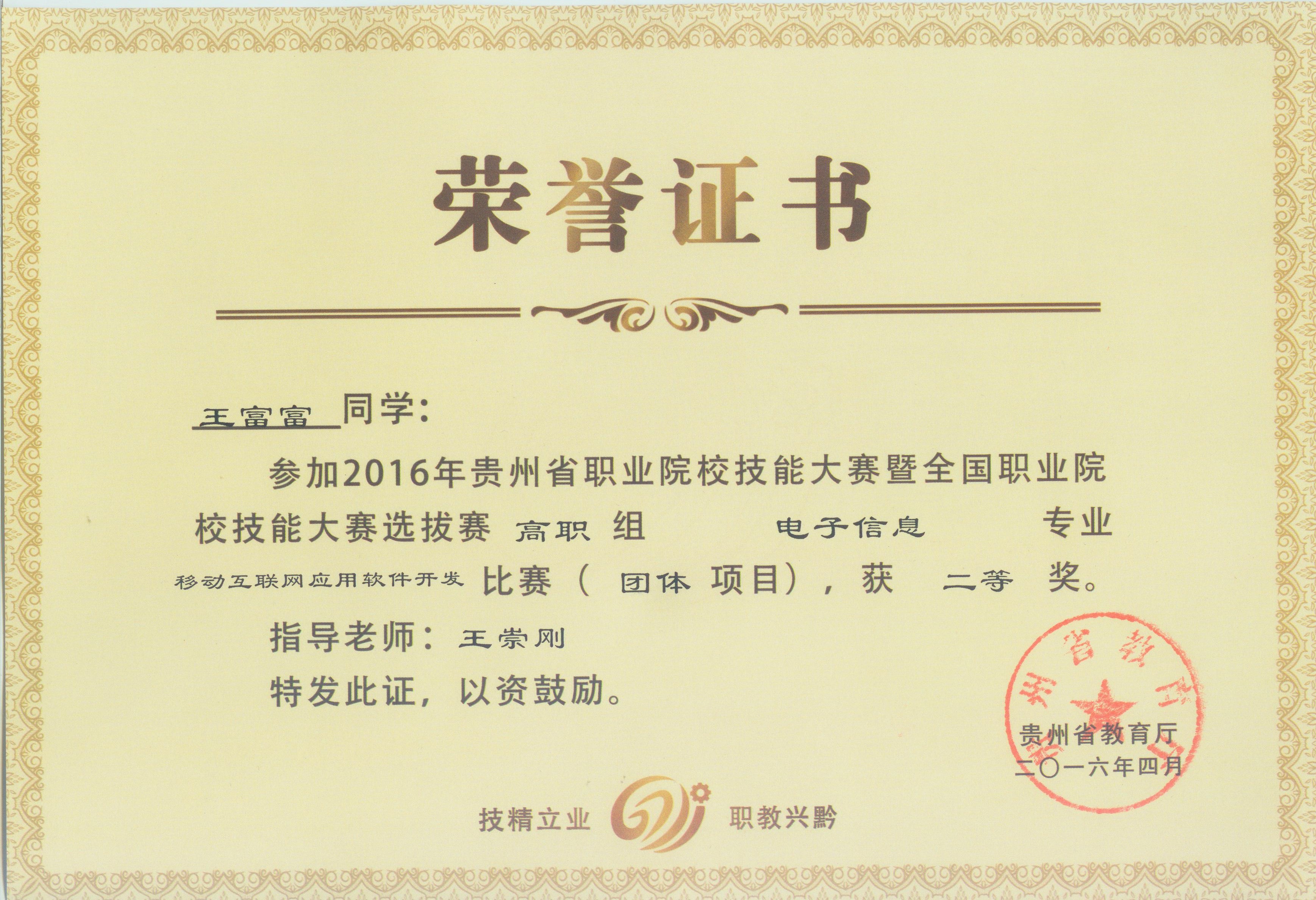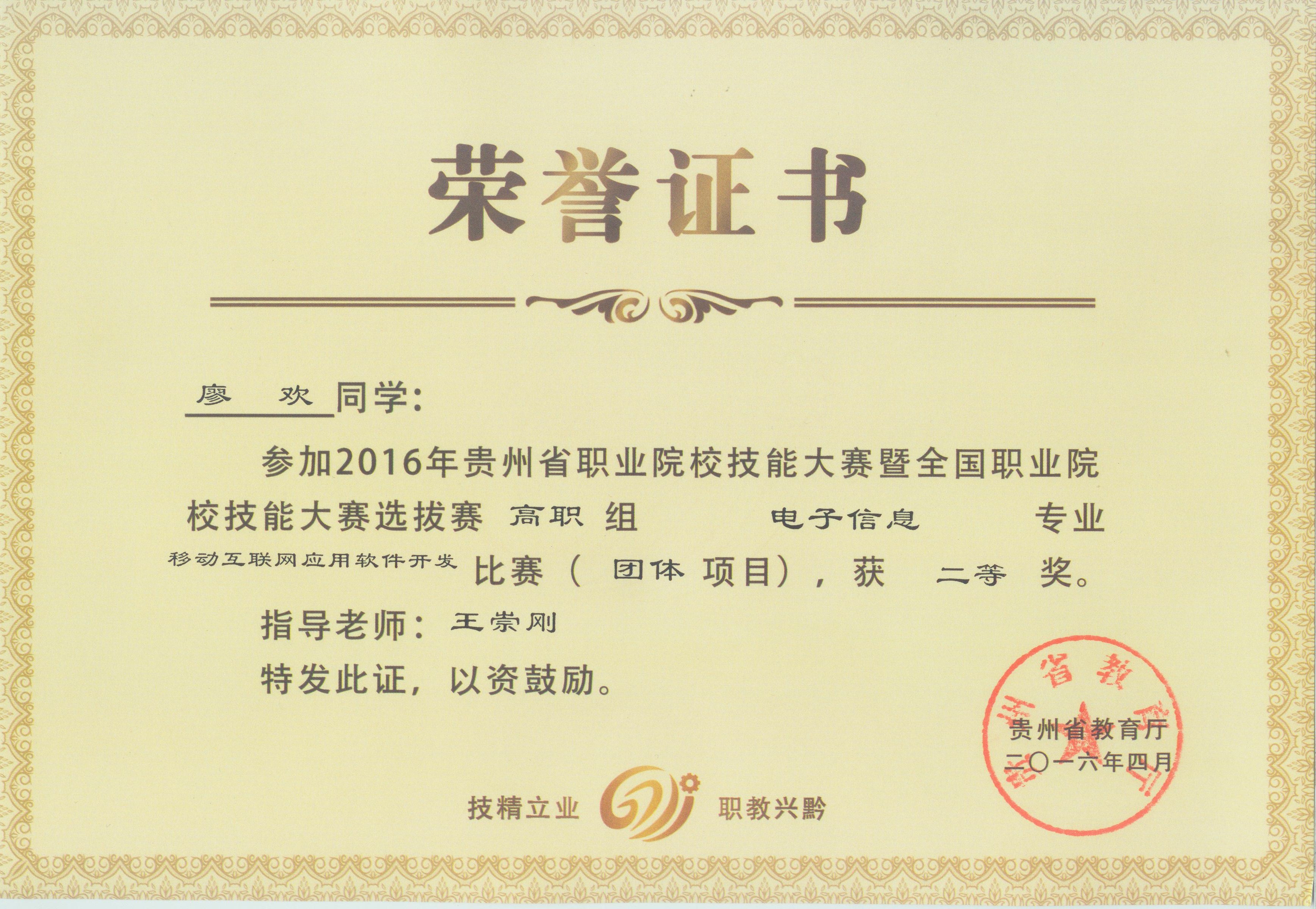 通过激烈角逐,信息工程学院的学生王富富、廖欢、黎廷涛三位同学获“移动互联网应用软件开发”项目比赛中获得二等奖(第二名),王崇刚老师获该项目的优秀指导教师。