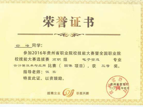 通过激烈角逐,信息工程学院的学生胡向进、孙轲、舒峰三位同学在“云计算技术与应用”项目比赛中获得三等奖,指导老师伍岳获该项目的优秀指导教师称号。