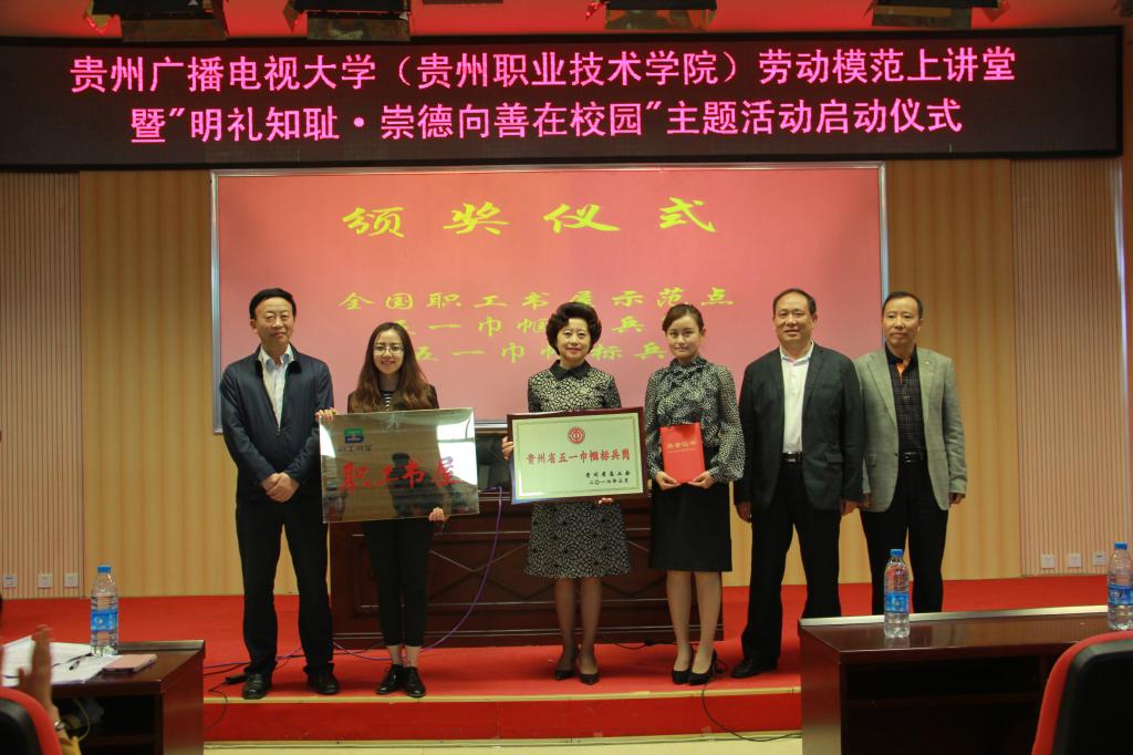 当天出席活动的校领导为全国职工书屋示范点——校图书馆,2015五一巾帼标兵获得者张俞老师,五一巾帼标兵岗获得单位远程教育教学部颁发了奖牌奖状。