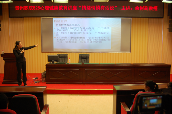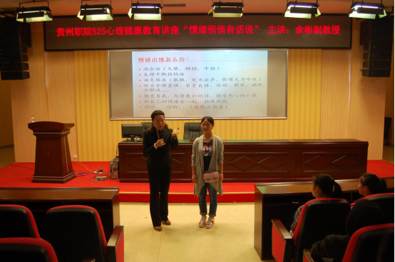 5月25日是全国大学生心理健康日,“5·25”的谐音即为“我爱我”,提醒大学生“珍惜生命,关爱自己”。核心内容是:关爱自我,了解自我,接纳自己,关注自己的心理健康和心灵成长,提高自身心理素质,进而爱别人,爱社会。2016年5月24日,在又一个“525”到来之际,基础部特邀贵阳职业技术学院心理咨询中心主任,国家二级心理咨询师余彬副教授到我院为学生作题为“情绪悄悄有话说”的讲座。