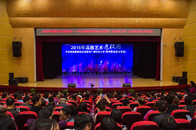 6月15日晚,由教育部、文化部、财政部联合主办,我校承办的“2016年高雅艺术进校园——中央民族歌舞团走进贵州广播电视大学(贵州职业技术学院)”活动在学院礼堂隆重上演。学校党委书记邓惠宾,校长李皖,党委副书记袁仁庆,副校长龚辉、李勤、徐伟,教育厅相关处室领导和800余名师生观看了演出。