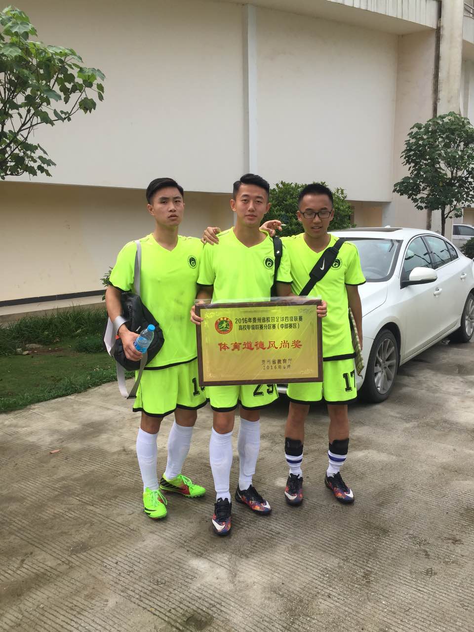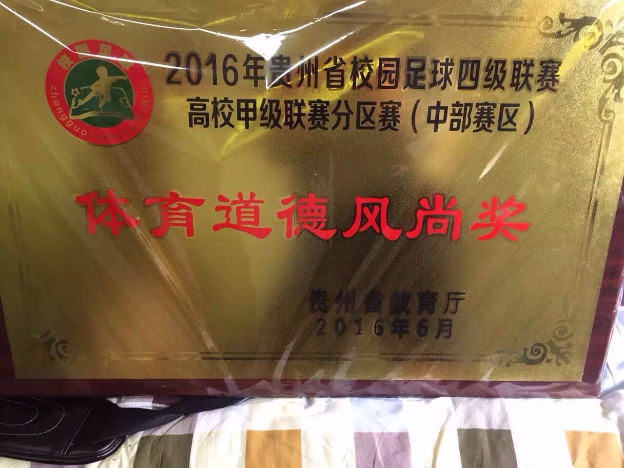 本年度贵州省高校足球联赛,我校获得中部赛区第四名,创历史最好成绩,并获得了由省教育厅颁发的体育道德风尚奖。我们将一如既往,加强球队日常训练,力争在以后的比赛中再创佳绩。