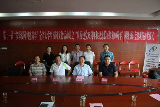 6月29日10:30,第十一届“多彩校园闪亮青春”全省大学生校园文化活动月之“庆祝建党95周年和纪念长征胜利80周年”网络知识竞赛现场抽奖仪式在我校云潭南路校区行政楼8楼会议室举行。抽奖仪式由学校党委宣传部于立群主持,出席的领导及嘉宾有:省委教育工委副书记赵廷昌、省教育厅社政处处长赵祥、校党委书记邓惠宾、党委副书记袁仁庆、惠普中国贵州办事处政企教育负责人代安琦、贵州师范大学党委宣传部部长路言莉、贵州民族大学党委宣传部部长黄平、贵州师范学院党委宣传部部长邹晓青、我校各学院党总支书记、相关部门负责人及记者团、团委学生会代表。此次网络知识竞赛由省委教育工委主办,贵州广播电视大学(贵州职业技术学院)承办。全省57所高校,有86399名学生参与注册答题,其中我校有9219名学生参加了本次比赛。