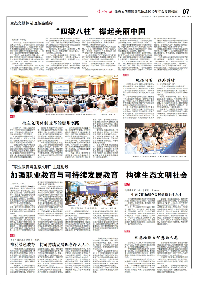 2016年7月11日,贵州日报第7版,大幅报道了由我校承办的“职业教育与生态文明”论坛。