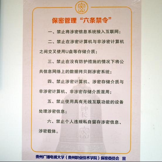 期间,教务处再次对各类考试保密制度进行梳理和完善,特别针对2015-2016年度电大、职院考试保密培训、会议记录,试卷保管记录,相关文件,培训通知,试卷印制、保管相关记录和承诺书书等材料进行了核查,配合教务处保密室之前上墙的试卷保密室值班工作规定、保密室管理暂行规定,教务处还在保密值班室粘贴了保密委统一制作的“保密管理‘六条禁令’”以提醒和警示相关人员,在思想上构筑严密的保密防线。教务处全体工作人员表示,通过再次梳理和学习,大大增强了全体工作人员的保密责任感,巩固和丰富了保密知识,今后将在工作中时时树立保密意识,严格要求自己认真履行工作职责。