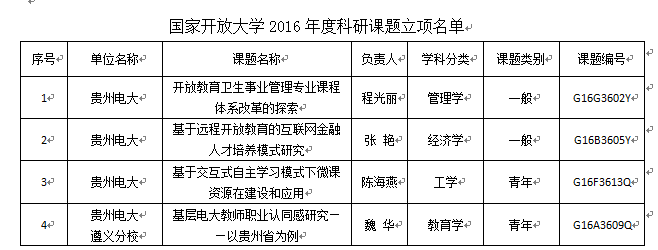 按照《关于申报国家开放大学2016年度科研课题的通知》(国开研〔2016〕2号)要求,国家开放大学组织开展课题评审立项工作,现拟确定168项课题获准立项,其中重点课题26项,一般课题97项(含19项立项后资助项目)、青年课题45项。我校科研处组织申报13项项目,获准立项4项。其中一般项目2项,青年项目2项。请项目负责人积极开展研究工作,按时按质完成项目研究。