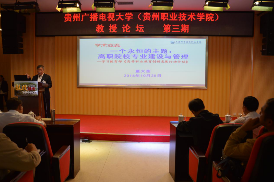 2016年10月25日下午,贵州广播电视大学(贵州职业技术学院)第三期“教授论坛”如期开讲。本期教授论坛我校荣幸地邀请到了教育部评估专家、同济大学高等技术学院原常务副院长董大奎教授,为我校教职工带来了精彩的讲座。
