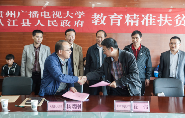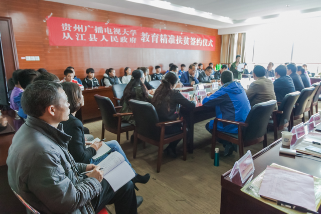 最后,杨瑞刚副县长代表从江县人民政府,徐伟副校长代表学校,正式签署了《贵州广播电视大学(贵州职业技术学院)教育精准扶贫从江县框架协议》。《框架协议》从相关招生类型、补贴对象及政策、师资协作、结对帮扶时间、组织机构5个方面作了明确规定。这标志着我校与从江县人民政府将从更深层次携手合作、共同推进对从江县精准扶贫工作。