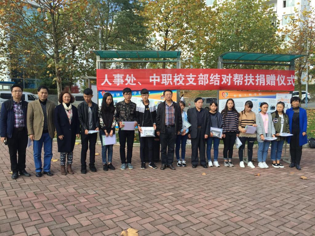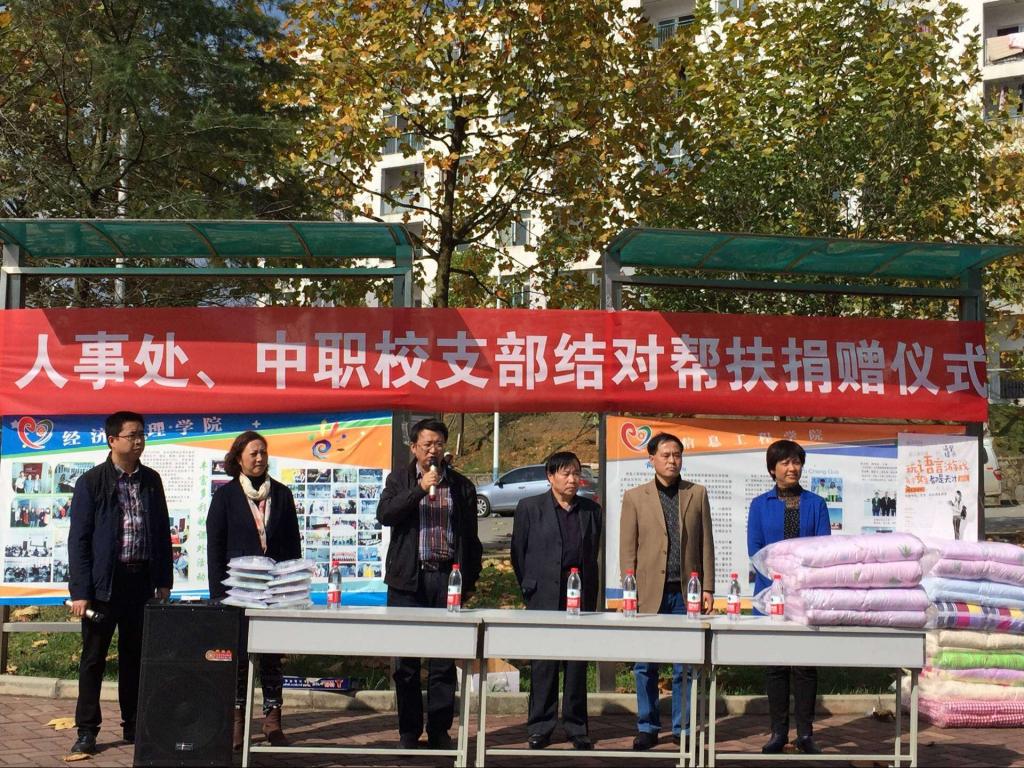 为扎实推进“两学一做”学习教育,本着重点落实做合格党员、为学生做实事的宗旨。17日中午,人事处党支部、中职校党支部举行结对帮扶中职家庭困难学生捐赠仪式,对19名家庭经济相对困难的学生,以捐赠棉被、学习用品的方式表示慰问。人事处、中职校全体党员参加。党委委员、副校长徐伟、机关党总支书记卢达文、中职校校长陈静淳、人事处处长李晓平、人事处党支部书记、副处长孙燕等领导出席了捐赠仪式。