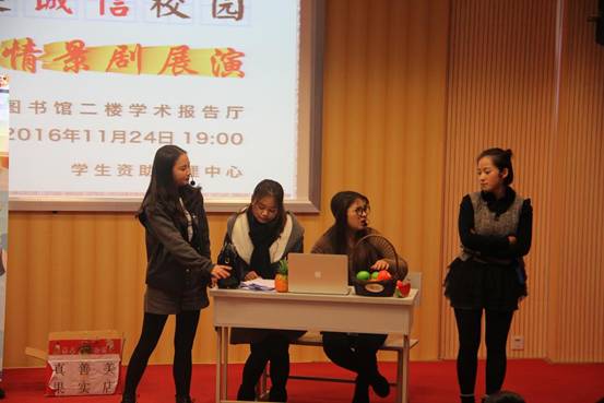 根据省教育厅相关要求,为进一步做好我校学生诚信教育工作,积极构建“以诚信为荣”的校园文化氛围,提高资助育人实效,学生资助管理中心在全校范围内开展了以“树诚信之风,建诚信校园”为主题的诚信教育系列活动。11月24日晚19点,贵州职业技术学院2016诚信教育情景剧展演在我校图书馆二楼学术报告厅成功举行,学生资助管理中心主任陈鹰、各学院团总支、辅导员代表及200余名学生参加。活动由学生资助管理中心副主任刘婕主持。