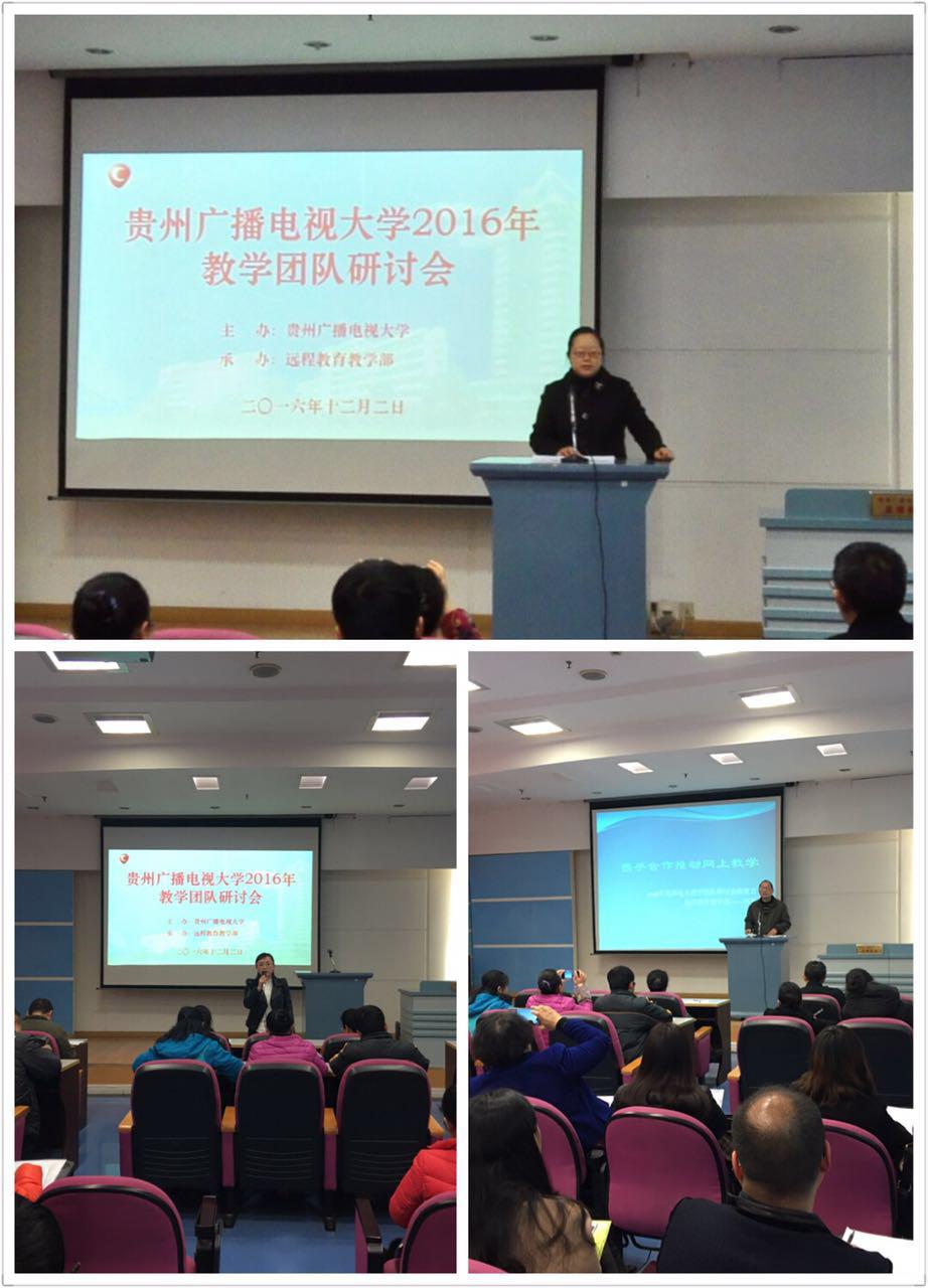 为了促进我校教师团队整体业务水平的不断提高,在远程环境下建立教师交流共享的渠道,促进教与学的全面互动,开启贵州电大教学团队活动的新模式,远程教育教学部于2016年12月2日在综合大楼4楼学术交流中心召开了贵州广播电视大学2016年教学团队研讨会。会议由远程教育教学部副主任程守艳老师主持,李勤副校长、学校相关部门负责人、各分校领导及教学管理人员、重点专业和课程团队负责人参加了本次研讨会。