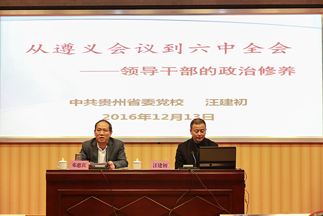 2016年12月13日,我校举行学习贯彻党的十八届六中全会精神专题报告会,省委党校副校长汪建初同志作了题为《从遵义会议到六中全会--领导干部的政治修养》专题辅导报告。校领导、全体中层干部、副科级以上干部、全体辅导员及学生代表共300余人聆听了报告。报告会由校党委书记邓惠宾同志主持。