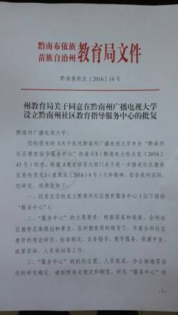 2016年12月13日,黔南州教育局下发《关于同意在黔南州广播电视大学设立黔南州社区教育指导服务中心的批复》(黔南教职发〔2016〕14号),同意依托黔南州广播电视大学成立黔南州社区教育指导服务中心。