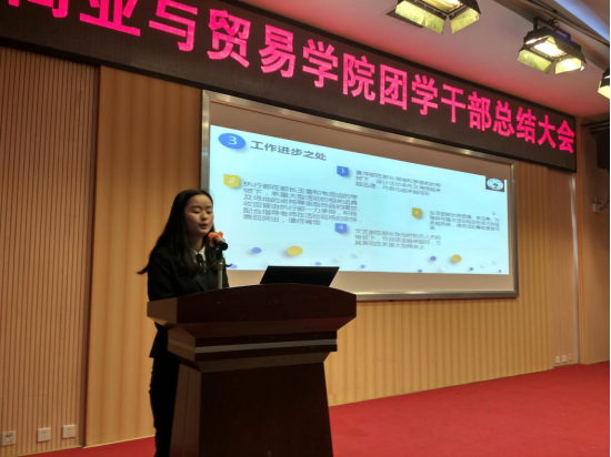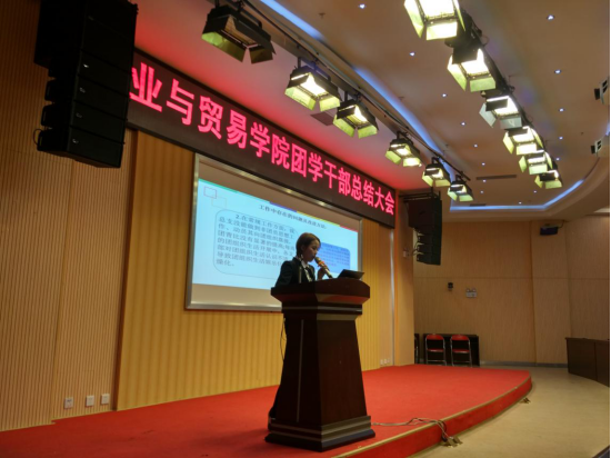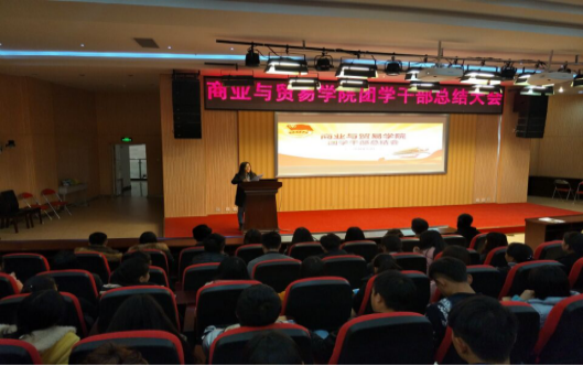2016年12月22日19:00,商业与贸易学院团学干部总结会在图书馆报告厅举行。会议由商贸学院团总支书记汪皓萌主持,商贸学院党总支副书记王永峰出席,全院团学干部参加。