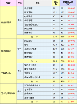 2016年我校就业工作在学院党委行政的领导下,在省高校毕业生就业工作办公室的指导下,通过职能部门和各学院的通力协作,取得较好成绩,圆满完成年初制定的目标任务,根据系统12月31日统计,我校年终就业率达97.77%。具体完成情况如下: