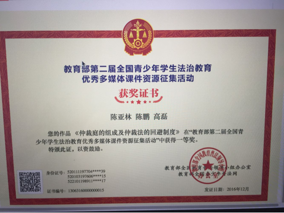 在由教育部全国教育系统普法领导小组办公室(教育部政策法规司)统一组织,普法网承办的第二届青少年学生法治教育优秀多媒体课件资源征集活动中,我校教学资源中心根据活动具体要求,筛选出远程教育教学部陈亚林老师主讲的仲裁法课程参赛。在教学资源中心龙春琳教师的指导下,陈亚林老师和课程团队中的陈鹏老师、高磊老师合作制作了《仲裁庭的组成及仲裁法的回避制度》微课参与此次征集活动。