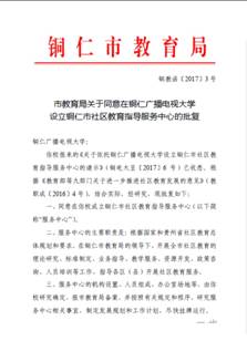 近日,铜仁市教育局下发《关于同意在铜仁广播电视大学设立铜仁市社区教育指导服务中心的批复》(铜教函〔2017〕3号),同意依托铜仁广播电视大学成立铜仁市社区教育指导服务中心。