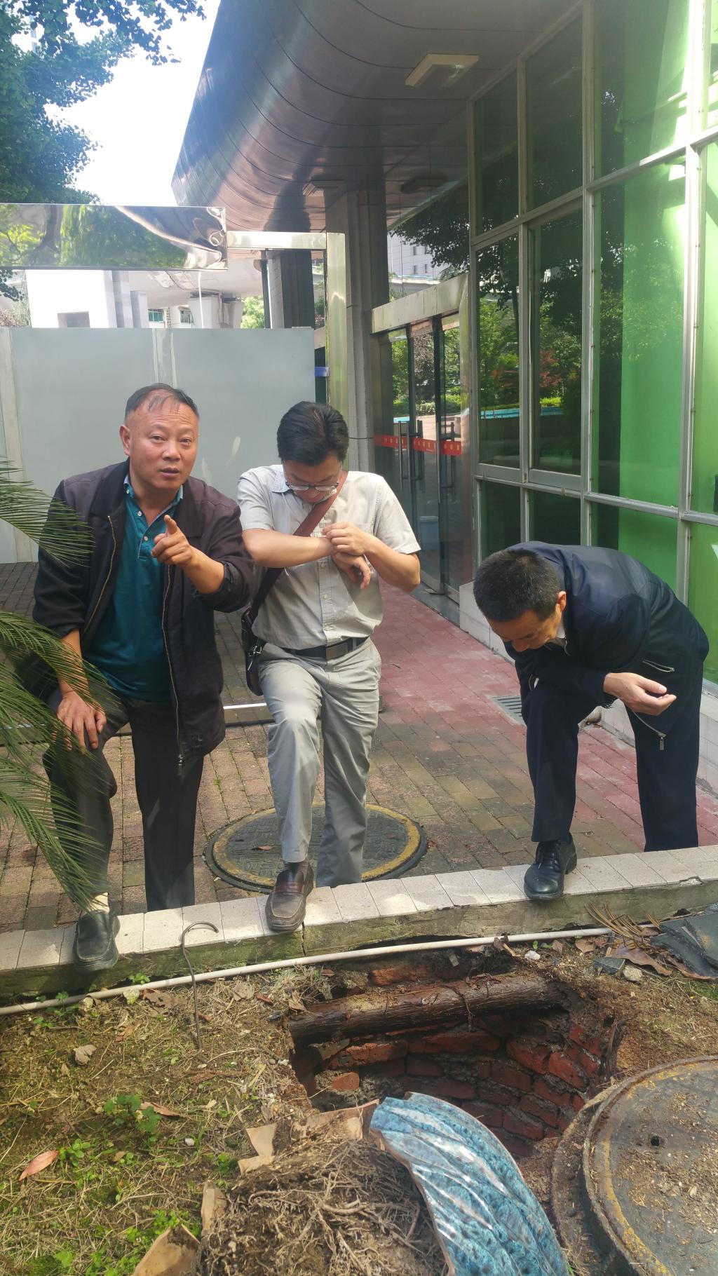 龚辉副校长亲自踏勘了解远程大楼的水网布局,清楚大楼的供水情况,水池与水箱容量以及水表、水阀位置,通过现场了解,基本确定疑漏区域位于水阀位置到大楼进口,最后指导现场工作人员开展检漏工作,并在一隐蔽管道井处发现疑是漏点,且水流量较大,龚辉副校长立即与基建科相关人员确定施工方案,并指示工期要抓紧同时确保工程质量。