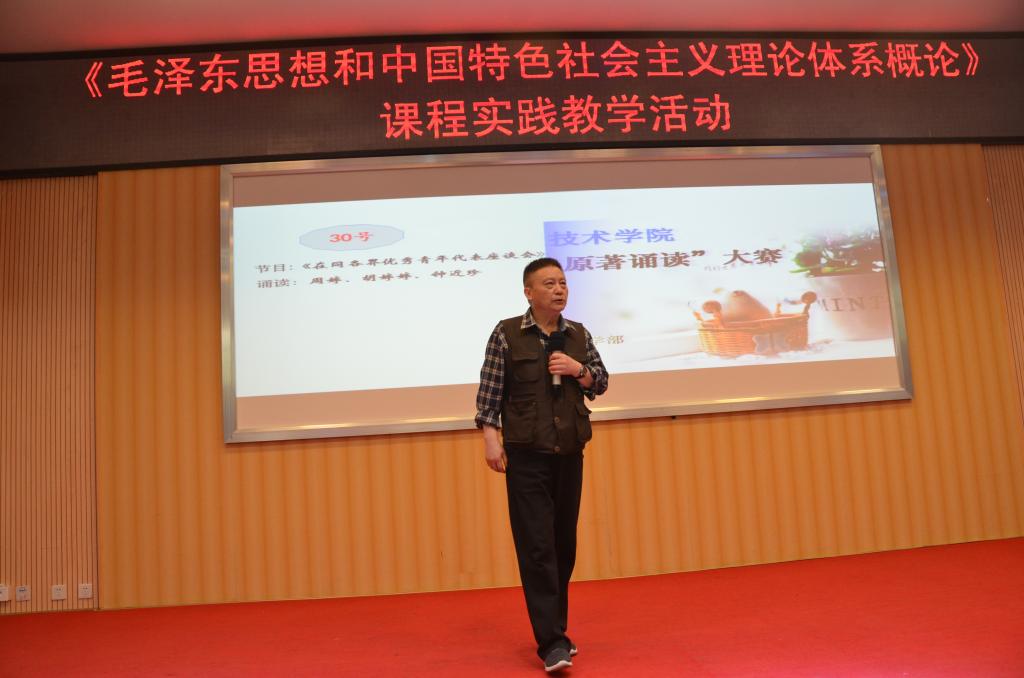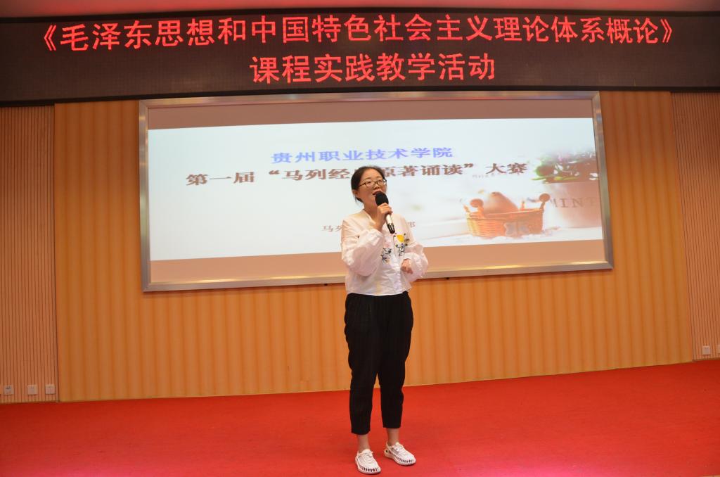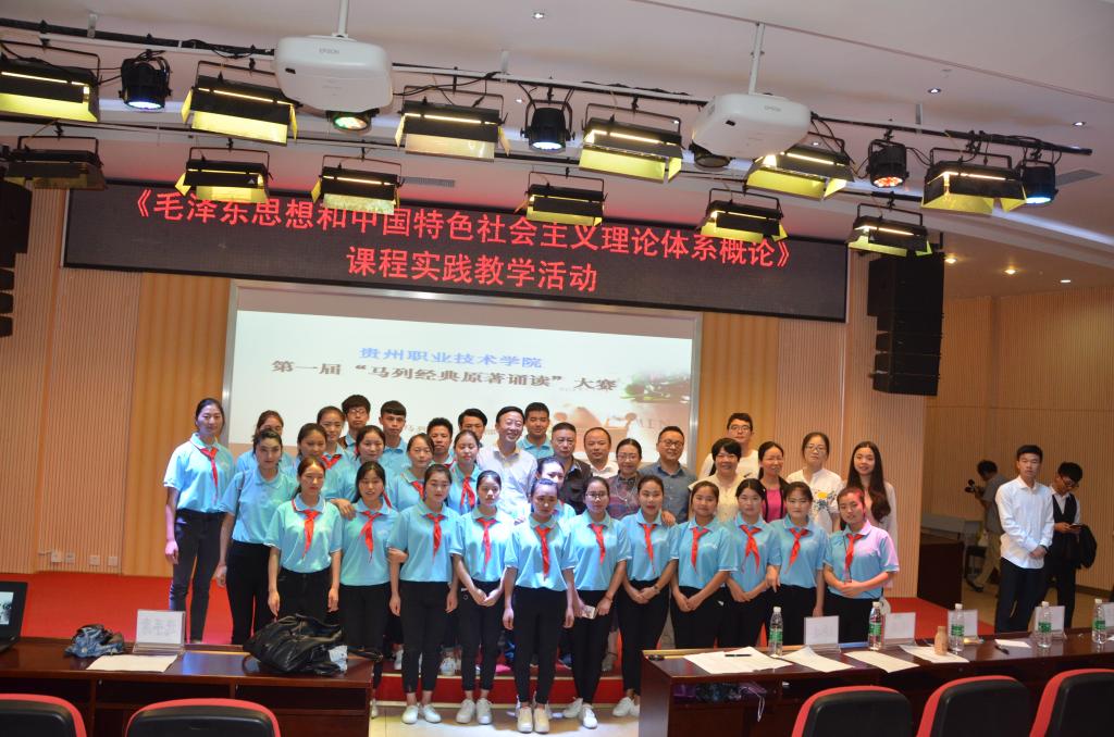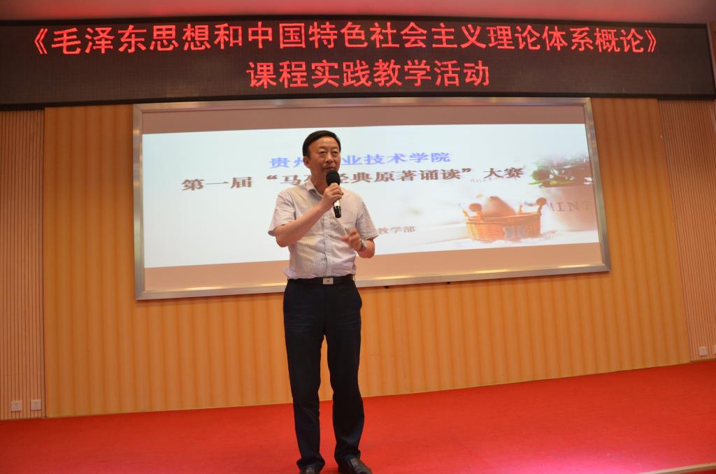 为贯彻落实全国高校思想政治工作会议精神,落实贵州省高校思想政治工作会议精神,迎接学校思想政治工作会议的召开,进一步丰富校园文化生活,丰富思想政治理论课教学的形式,提高青年大学生对马克思主义的信仰,在全校范围内形成学习马克思主义经典理论和阅读红色文学的进步风气,马列主义教学部于6月8日下午,在学院图书馆二楼多功能报告厅,举行了“向经典致敬——马列经典原著诵读”比赛暨《毛泽东思想和中国特色社会主义理论体系概论》实践教学活动。校党委书记邓惠宾老师、副书记郭万才老师参加了活动。《学报》副主编孙鲁痕教授、校办副主任姚楠老师、招就中心副主任李江波老师、学生处孙飞老师、艺术与设计学院陈露老师、谭雪老师、马列部黄丹老师等担任本次活动的评委,马列部全体教师和2016级两百多名同学参加了活动。
