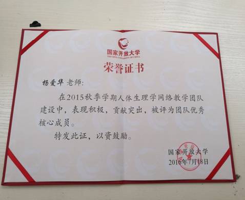 为探索创新“六网融通”人才培养模式,有效落实网络课程教学过程,整合办学体系师资力量,提高学习支持服务的水平,国家开放大学于2015年秋启动了网络教学团队试点工作。自国开首批网络课程教学团队建立以来,远程教育教学部就积极动员组织老师们参与了多门网络核心课程的建设,其中杨爱华老师参加了《人体生理学》网络课程教学团队。杨爱华老师不负众望,积极努力工作,不断提升在线协作教学能力,参与国家级精品网络在线课程《人体生理学》的建设。在2015秋季学期《人体生理学》网络教学团队建设中,表现积极,贡献突出,被评为团队优秀核心成员。