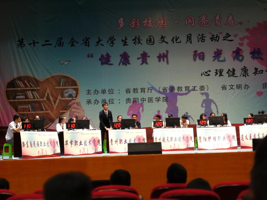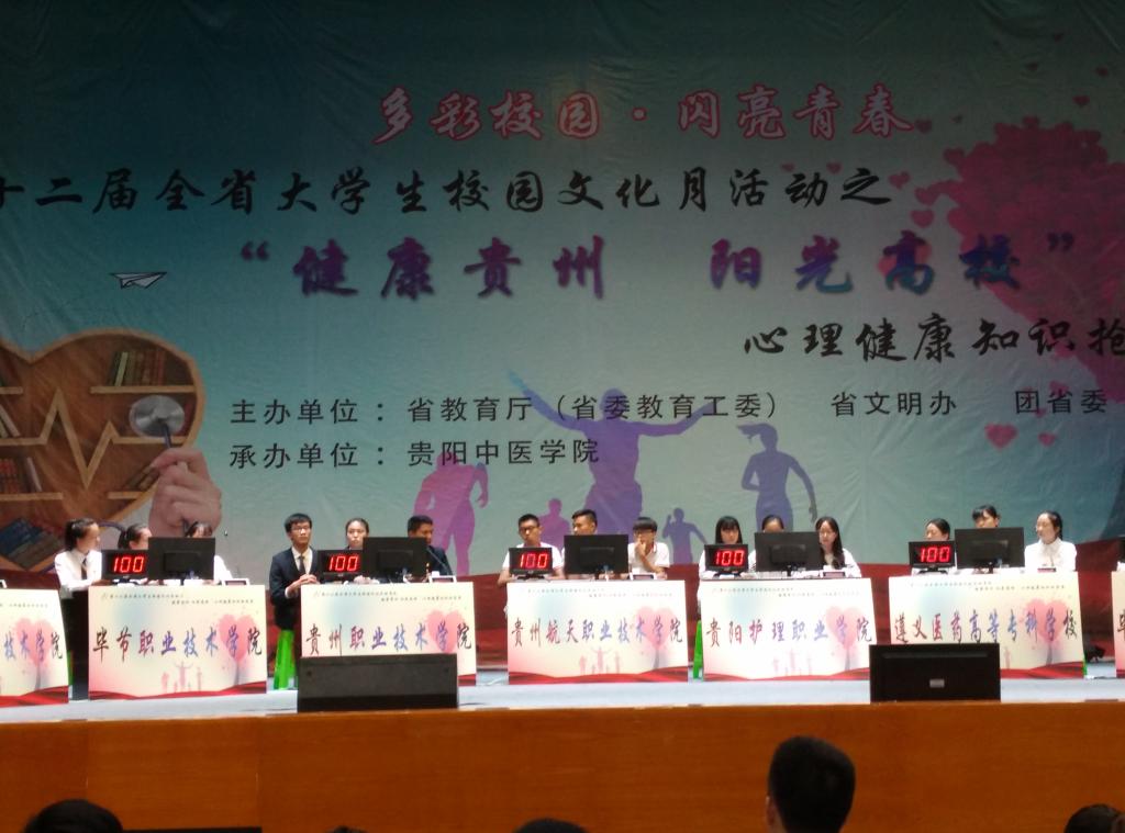 9月27日至29日,第十二届全省校园文化节之“健康贵州,阳光高校”全省大学生心理健康知识抢答赛在贵阳中医学院新校区举行。我校基础部蒋兴旺、郑传春两位老师带领来至经管学院工商161班的陈元同学、酒店管理161的蔡逸瑶同学、会计166班的王华江同学,以及来至商贸学院物流162班的周婷四名同学代表我校参加本次比赛。本次大赛旨在丰富大学生课余生活,帮助大学生普及心理健康知识,拓宽大学生知识面,树立心理健康意识,优化心理品质,增强心理调适能力和社会生活的适应能力,预防和缓解心理问题。