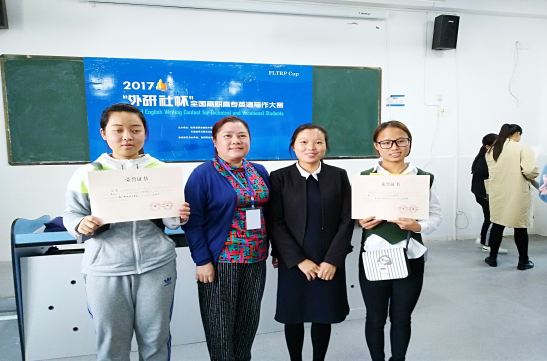 2017年10月29日,由教育部职业院校外语类专业教学指导委员会和外语教学与研究出版社共同举办的第八届“外研社杯”全国高职高专英语写作大赛复赛(贵州赛区)在贵阳职业技术学院如期举行。 我校教师余胜映指导的两名学生在本次大赛中取得了优异的成绩。2016级会计(6)班邓晓丹同学和2015级工商管理(1)班余倩同学分别荣获公共英语组“二等奖”和“三等奖”。