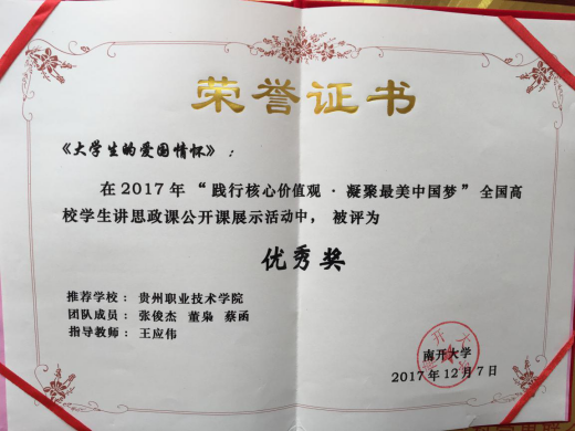 学校作为贵州省推荐的三所高校中的高职院校,与国内名校同台竞争,最终获得优秀奖,能够在全国高校众多作品中脱颖而出,这是我校高度重视大学生思想政治教育和思想政治理论课教学的充分体现,是我校在2017年高校思政课教学质量年工作中取得的可喜成绩,也是学校坚持贯彻“以生为本”的教育理念、积极推行思想政治理论课教学改革结出的丰硕成果,充分展示了我校思政课教学效果和学生学习水平、展现当代大学生的理论素养和精神风貌。