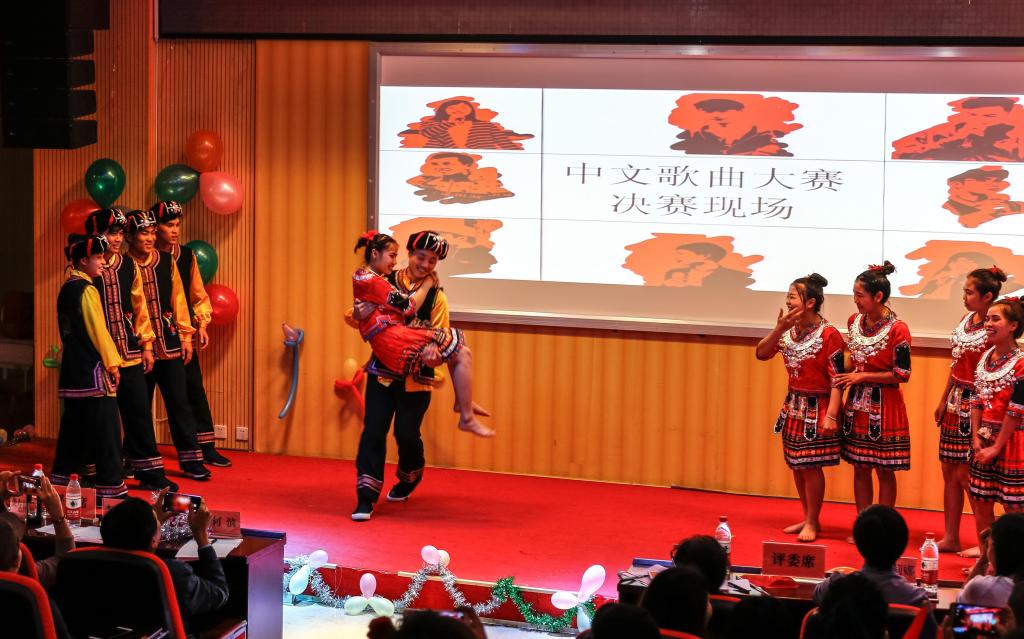 留学生们首先带来了欢快的苗族舞蹈《飞哥欢庆》为大赛助力。随后,黄一行同学深情演绎的中国民谣《成都》带领大家进入比赛的气氛。歌曲简单质朴的旋律,唱进了在场每一位观众的心坎里。裴少文同学演唱的《我们不一样》,他凭借独特的嗓音和不俗唱功,浑身散发着自信的光芒,瞬间点燃了全场的气氛。廖恒毅同学借歌曲《感谢妈妈》来表达对母亲诚挚的感恩之情,深深震撼了每个人的内心。越南同学邓玉艳和阮映玉还带来了吉他弹唱《绿草中摇曳的花》,带现场的观众重温童年的美好。每名参赛留学生都不甘示弱,充分展示自己精湛的汉语水平和演唱技巧,或歌声嘹亮、纵情豪放,或轻歌细语,旋律悠扬。他们个个都有备而来,毫无保留地释放出自己的歌唱能量,台下的粉丝呐喊助威,或送上鲜花,或与选手热情拥抱,台上选手与台下观众随着音乐互动整个比赛高潮迭起,异彩纷呈。
