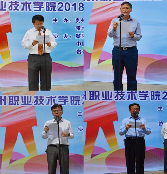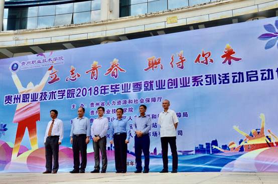 贵州职业技术学院于5月17日在校前广场隆重举行2018年毕业季就业创业系列活动的启动仪式。贵州省教育厅普通高校毕业生就业工作办公室主任张华、贵州省就业局副局长倪伟、贵阳市观山湖区就业局局长潘奇和中国青年创业社区(贵阳站)负责人罗海军等领导嘉宾莅临现场,学校领导李皖、徐伟、徐扬出席,启动仪式由招就中心副主任邓咏梅主持。