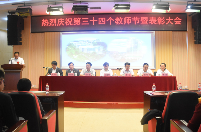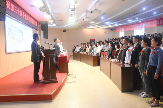 2018年9月7日下午,我校第三十四个教师节暨表彰大会在图书馆二楼报告厅隆重召开。党委书记王爱华、党委副书记、校长李皖、党委副书记郭万才、副校长龚辉、钱庆生、徐伟、李勤出席了会议,各部门主要负责人及部分师生代表参加了会议。会议由徐伟副校长主持。