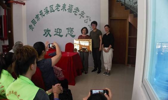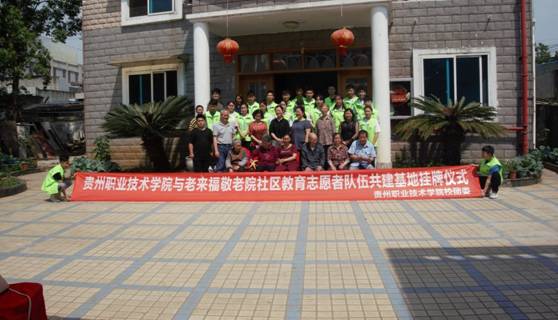 最后,贵州职业技术学院与花溪区老来福敬老院社区教育志愿者队伍共建基地举行挂牌仪式。