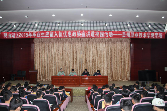 观山湖区人武部政委向立明作为主讲人,从国家、省和观山湖区对大学生入伍优惠政策进行了详细解读,鼓励大家积极投身军营,在部队中锻炼、提升自我。