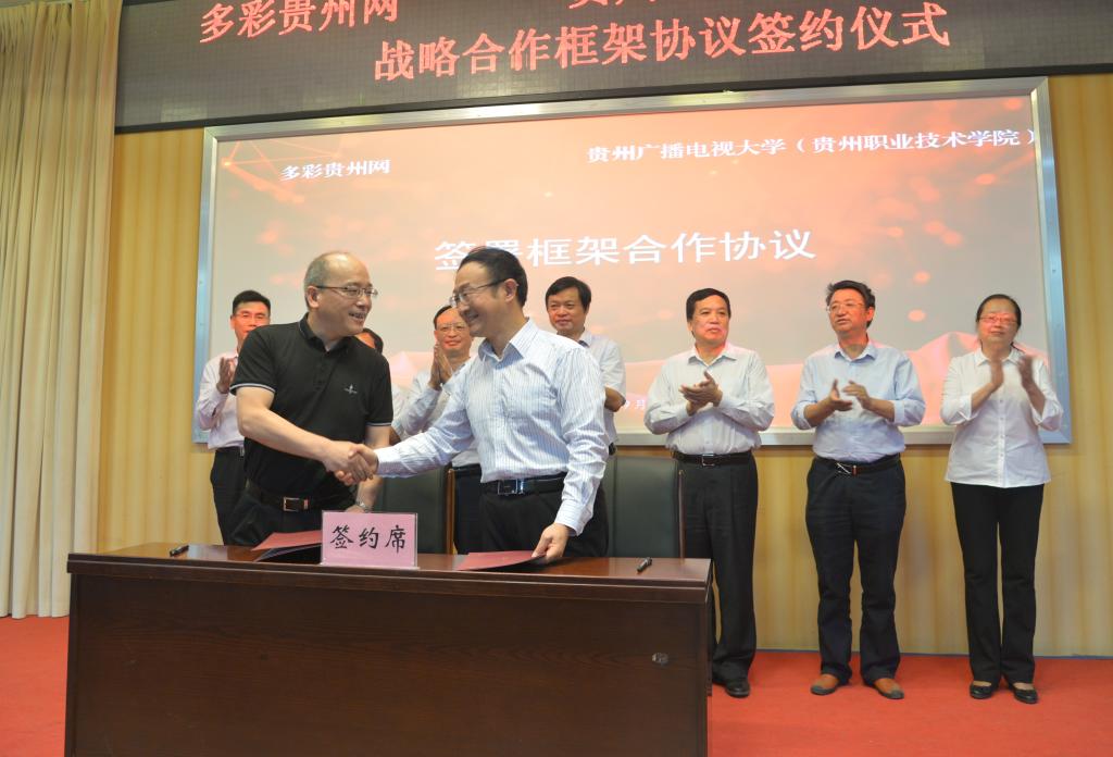 贵州广播电视大学(贵州职业技术学院)校长李皖与多彩贵州网党委副书记、副董事长、总经理万群签约。