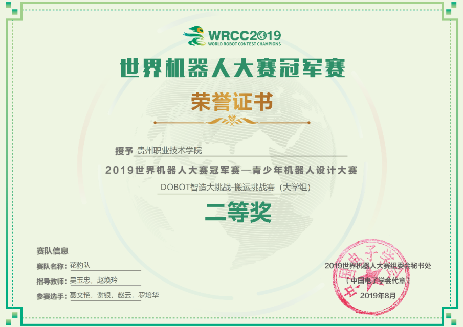 世界机器人大赛被誉为机器人界的“奥运会”,今年共设BCI脑控机器人大赛、共融机器人挑战赛、机器人工业设计大赛、青少年机器人设计大赛四大类赛事。2019世界机器人大赛已在全球举办了多场选拔赛,全年累计参赛人数已超40000人。本次大赛冠军赛共有来自中国、俄罗斯、日本、韩国、美国、新加坡、墨西哥、菲律宾等全球10余个国家和地区的1000余支赛队参赛,是目前国内外极具影响力的机器人领域官方赛事,旨在为全球科技创新人才培育后续力量,推动普及青少年科技教育,作为2019世界机器人大赛冠军赛四大赛项之一, “青少年机器人设计大赛——DOBOT智造大挑战”赛项邀请了来自全球的将近600余名青少年,129支参赛队伍精英选手各凭本领同台比拼。通过轮番对决,我校参赛选手在激烈的比赛中沉着应战,不断克服困难,发挥了良好的专业技能水平,经过三天的激烈角逐,我校“花豹队”(学生:罗培华、聂文艳、赵云、谢银,指导教师;赵焕玲,吴玉忠)最终荣获大学组团体二等奖的好成绩,贵州省代表队第一名。