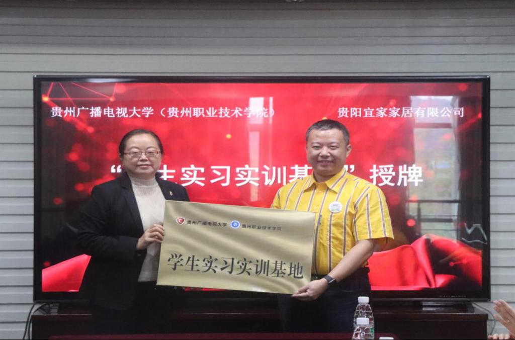 签约仪式结束后,贵州广播电视大学(贵州职业技术学院)副校长李勤为学生实习实训基地授牌,贵阳宜家家居有限公司经理张凯航接牌。