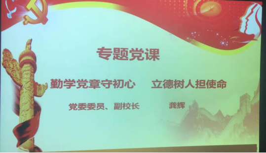 龚辉同志党课内容分为三部分:一是学习《中国共产党章程》;二是“不忘初心、牢记使命”主题教育学习体会;三是落实立德树人的使命,对新教师提出要求,对学生入党积极分子寄予希望。