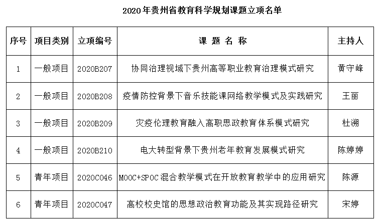 根据《省教育厅关于组织2020年省教育科学规划课题申报工作的通知》(黔教函〔2020〕11号),科研处组织申报48项项目,经校内外专家初评推荐后,上报15项项目。经贵州省教育科学规划课题评审委员会立项评审,获准立项4项一般项目,2项青年项目。请项目负责人遵照《贵州省教育科学规划课题管理细则》规定,认真开展研究工作,按时按质完成项目研究。