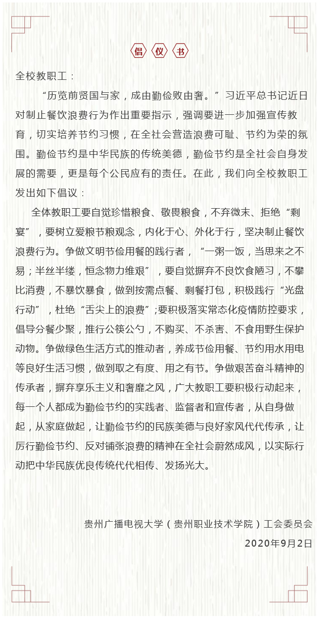 贵州广播电视大学(贵州职业技术学院)工会“厉行勤俭节约,反对餐饮浪费”倡议书