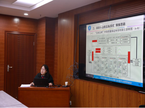 紧接着,李政敏副主任对学校诊改平台五纵系统的填报思路进行了简明扼要的介绍。结合学校实际确定“五纵五横系统”的构架,明确各部门在五纵系统中的定位,在决策指挥、资源建设、支持服务、质量生成以及监督控制系统五个层面,以完善规划、明确目标、健全标准、规范流程、形成制度、促进质量保证体系建设为基本内容开展填报工作。