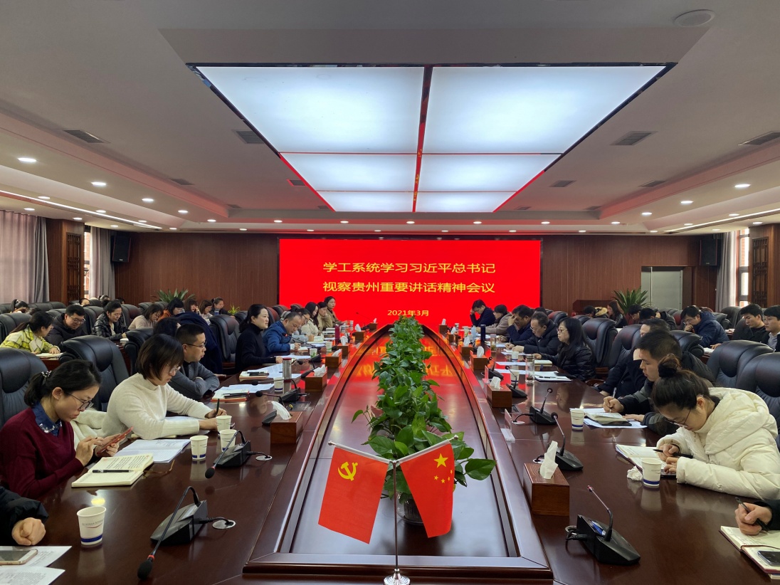 为深入贯彻落实习近平总书记视察贵州重要讲话重要指示精神,促进学生工作质量进一步提升,3月3日上午,由党委学工部牵头,组织召开了学工系统学习习近平总书记视察贵州重要讲话重要指示精神会议。会议由学工部部长姚楠主持,学校党委委员、副校长于立群出席会议,各学院分管学生工作书记、新建学院筹备组负责同志、全体辅导员及学工部全体人员参加了会议。
