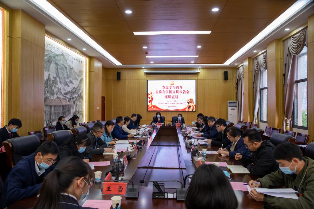 在随后的座谈宣讲会上,王爱华书记围绕调研提纲,在不同层面进行了深入调研,准确掌握党史学习教育中大家的思想动态。在互动交流环节,王爱华与参会师生代表就如何深入贯彻习近平总书记视察贵州讲话精神、做好党史学习教育;如何借助党史学习教育这个“东风”,全面加强党的领导和党的建设;如何借鉴党史学习教育的经验做法推动思想政治理论课教学改革;如何利用好我省红色文化教育资源,帮助青年大学生扣好人生第一颗扣子,让红色基因、革命星火代代传承;在党史学习教育背景下召开的全国职业教育大会,将对职业院校学生的成长成才带来怎样的影响等问题进行了深入交流探讨。
