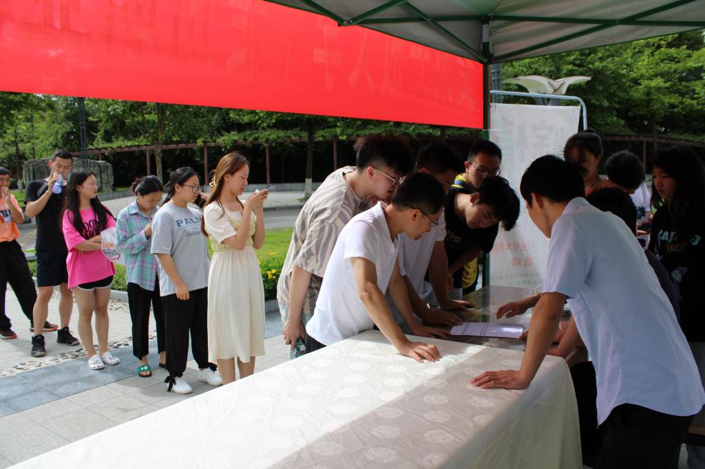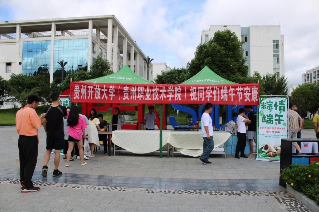 走到开放广场,同学们的注意力就被现场的海报和横幅吸引了,这是两张“贵州开放大学(贵州职业技术学院)祝同学们端午节安康”的横幅和“粽情端午”的海报,海报上面还附有“全校学生可免费领取粽子和咸鸭蛋”的提示。