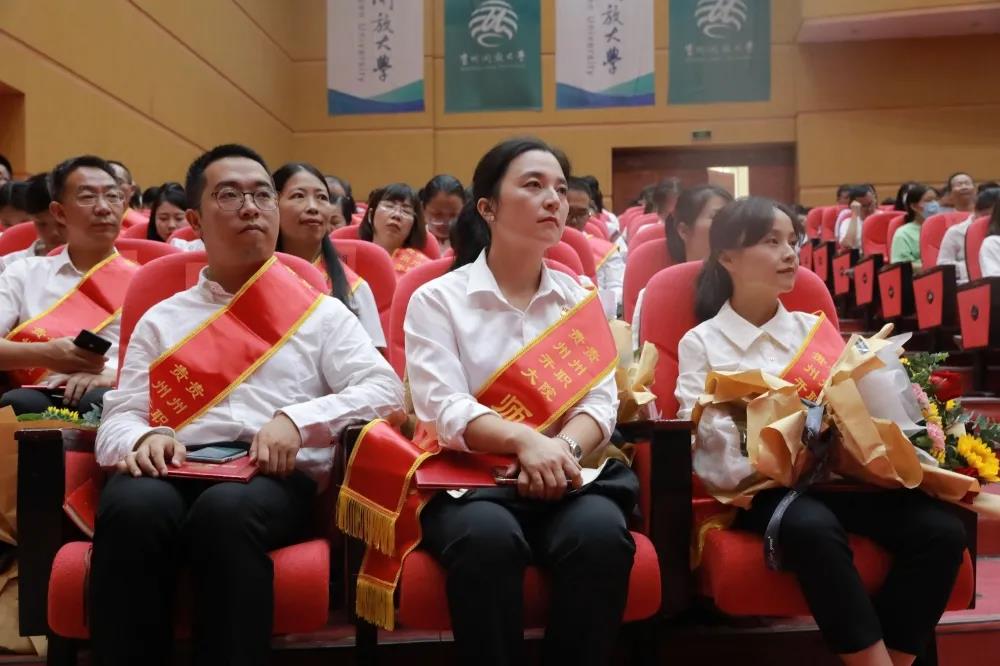 表彰大会上,党委副书记龚辉宣读表彰决定,充分肯定了受表彰教师们对学校教育教学工作做出的贡献,引导全体教职工以先进为榜样,积极探索新时代教育教学方法,不断提升教书育人本领。郭知涛等37位教师代表上台接受了荣誉表彰,学生代表用鲜花表达了对老师们诚挚的谢意和节日的祝福。