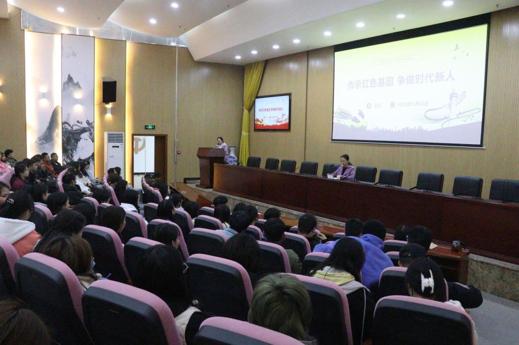 时光不老,青春正好。2021年11月11日下午,在行政楼九楼会议室,学校党委委员、副校长汪红为商业与贸易学院学生上了一堂主题为“传承红色基因 争做时代新人”的思政课。