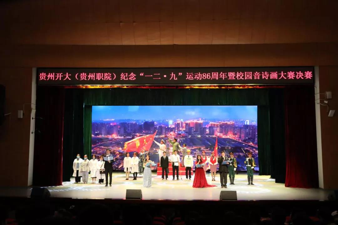 在全校上下深入学习贯彻党的十九届六中全会精神和省委十二届十次全会精神,扎实开展党史学习教育之际,2021年12月8日,贵州开放大学(贵州职业技术学院)纪念“一二·九”运动86周年暨校园音诗画大赛决赛在学校大礼堂举行,学校党委书记宋广强,党委副书记、校长汤健,党委副书记龚辉、钱庆生,党委委员、副校长李勤,党委委员、纪委书记骆最勇,党委委员、副校长于立群,党委委员、党委组织部部长张仁俊,党委委员、党委宣传统战部部长何滨出席活动,学校相关部门负责人,各学院党政班子成员,全体辅导员老师及学生代表800余人参加活动。